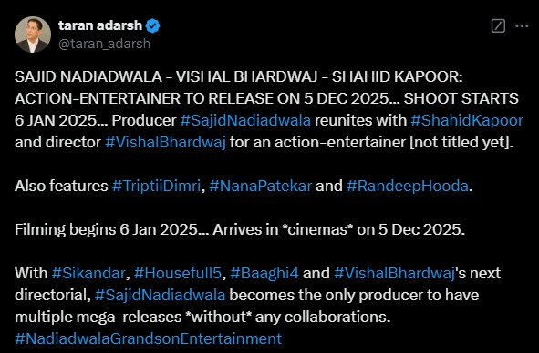 शाहिद की इस फिल्म की शूटिंग की शुरुआत नए साल में 6 जनवरी 2025 से शुरू हो जाएगी। साथ ही इसकी रिलीज डेट से भी पर्दा उठ गया है, जोकि 5 दिसंबर 2025 रहेगी। इस खबर के बाद शाहिद कपूर के फैंस की एक्साइटमेंट काफी बढ़ गई है। बता दें कि ये पहला मौका होगा, जब शाहिद और तृप्ति पहली बार किसी मूवी में एक साथ नजर आएंगे।