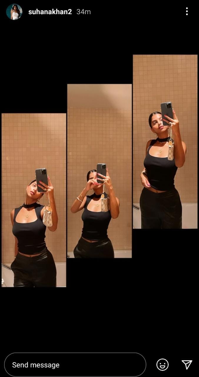सुहाना खान ने अपने इंस्टाग्राम स्टोरी पर अपनी एक लेटेस्ट तस्वीर शेयर की है। इस तस्वीर में वह मिरर सेल्फी लेती दिख रही हैं। सुहाना खान तस्वीर में ब्लैक कलर की डीप नेक टॉप के साथ ब्लैक कलर की पैंट में दिख रही हैं। वहीं आप देख सकते हैं कि उनके हाथ में मोबाइल के साथ एक छोटा सा बैग भी दिख रहा है। वहीं उन्होंने एक साथ तीन सेल्फी का कोलाज शेयर किया है। हर तस्वीर में उनका अंदाज जुदा होने के साथ ही ग्लैमरस नजर आ रहा है। इन तस्वीरों में वह अलग अलग पोज देती दिख रही हैं। फैंस सुहाना की इस तस्वीर को काफी पसंद कर रहे हैं।