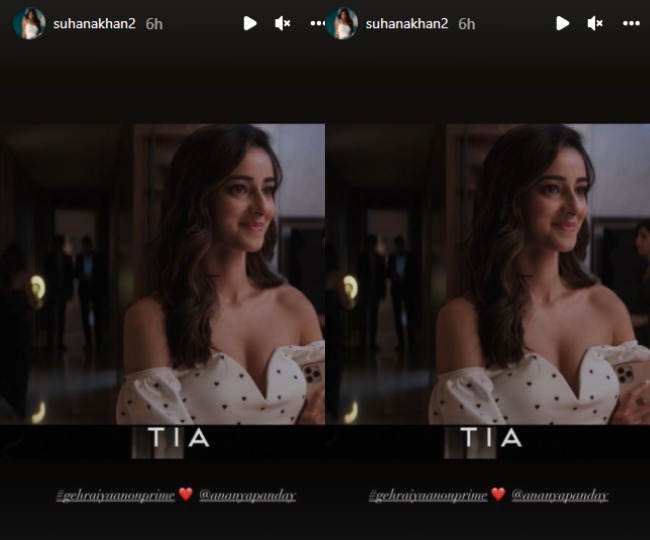 फिल्मों में कदम रखने से पहले सोशल मीडिया स्टार बन चुकीं सुहाना खान 'गहराइयां' देखने के बाद अपनी दोस्त अनन्या पांडे की तारीफ करती हुईं दिखाई दीं। शाहरुख खान की लाड़ली सुहाना ने अपनी इंस्टा स्टोरी पर अनन्या पांडे के किरदार की एक तस्वीर शेयर की। इस तस्वीर के साथ सुहाना ने टिया लिखा। बता दें कि अनन्या पांडे की फिल्म में उनके किरदार का नाम टिया है। इसी के साथ उन्होंने अपनी बेस्ट फ्रेंड के लिए 'गहराइयां' लिखते हुए हार्ट इमोजी पोस्ट किया। सुहाना खान की इंस्टा स्टोरी को फैंस काफी पसंद कर रहे हैं।