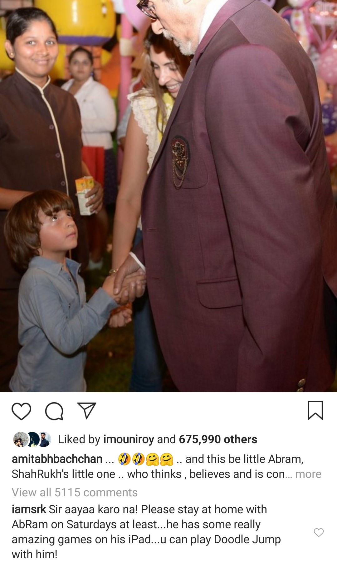 इस तस्वीर के साथ अमिताभ ने लिखा है- ''और यह हैं नन्हे अबराम, शाह रुख़ के छोटे बेटे, जिन्हें लगता है, बल्कि यक़ीन है और बिना किसी संदेह के वो मानते हैं कि मैं उनके पिता का पिता हूं, और उन्हें (अबराम) यह देखकर हैरानी होती है कि शाह रुख़ के पिता उनके साथ क्यों नहीं रहते?'' अबराम की इस क्यूटनेस पर अमिताभ की हंसी रोके नहीं रुक रही, जो उन्होंने स्माइलीज़ बनाकर ज़ाहिर किया है।