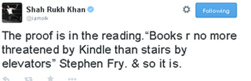 शाहरुख खान पहले भी अबराम की तस्वीरें ट्विटर पर पोस्ट कर चुके हैं। नई तस्वीर के साथ उन्होंने एक कैप्शन भी लिखा है, जिसमें जानेमाने एक्टर, राइटर स्टीफन फ्राई का एक कोट लिखा है, 'किताबें जलने से अब उतना नहीं डरतीं जितना सीढ़ियां लिफ्ट से डरती हैं।' इसके साथ यह भी लिखा है कि इसका सबूत किताब पढ़ने में ही मिलता है और यह सच भी होता है।
