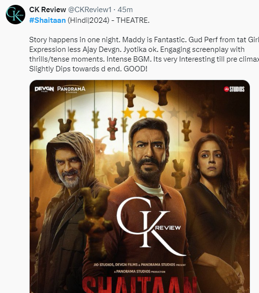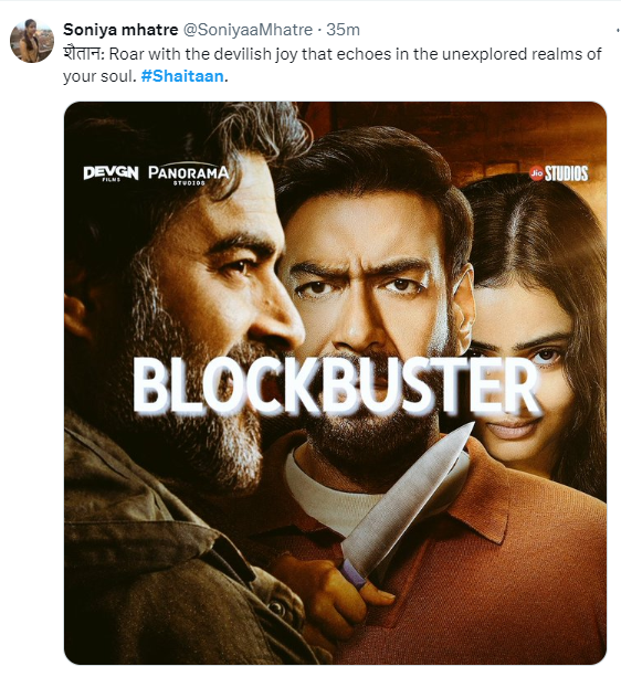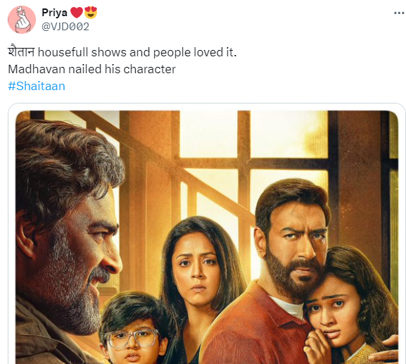 अजय देवगन और आर माधवन की फिल्म 'शैतान' को दर्शकों की अच्छी प्रतिक्रिया मिल रही है। एक यूजर ने लिखा, "हर कोई अजय देवगन और आर माधवन की एक्टिंग की सराहना कर रहा है, ब्लॉकबस्टर आ रही है"।