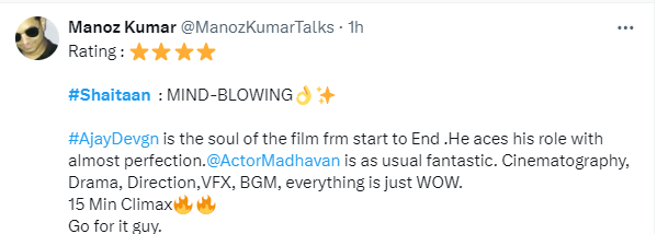 दूसरे यूजर ने लिखा, "शैतान बहुत ही अच्छी फिल्म है। आर माधवन जब-जब स्क्रीन पर आ रहे थे, तो मुझे बस ये लग रहा था कि कोई शैतान को मारे, इतना पावरफुल रोल था। इस फिल्म को आप इंटेंस सीन और बैकग्राउंड स्कोर के लिए थिएटर में देख सकते हैं"।