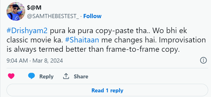 एक यूजर ने ट्वीट करते हुए लिखा, " दृश्यम 2 पूरी की पूरी कॉपी-पेस्ट थी, वो भी एक क्लासिक मूवी की। शैतान में चेंज है। किसी चीज में इम्प्रोवाइज करना हमेशा बेहतर होता है, बजाय फ्रेम टू फ्रेम कॉपी करने के"।