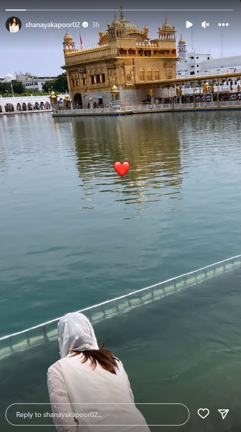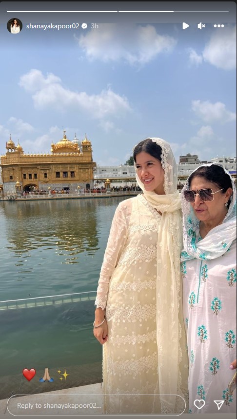 गोल्डन टेम्पल में अपने इस स्पेशल विजिट की शनाया कपूर ने कुछ तस्वीरें शेयर की हैं, जिन्हें उन्होंने अपनी इंस्टा स्टोरी में पोस्ट किया है। तस्वीरों में शनाया गुरुद्वारे में दर्शन करते हुए नजर आ रही है। हमेशा ग्लैमरस लुक में नजर आने वाली शनाया इस बार व्हाइट कलर के सलवार-कुर्ते में दिख रही हैं, सर को दुपट्टे से ढके सादगी में भी वह बेहद खूबसूरत लग रही हैं। गोल्डन टेम्पल में दर्शन करने के लिए वह अपनी नानी नमिता संधू संग पहुंचीं। एक तस्वीर में वह नानी संग पोज करते हुए भी नजर आईं।