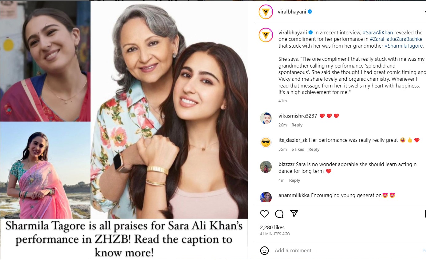 विरल भयानी ने एक पोस्ट शेयर की है, जिसमें बताया गया है कि सारा ने एक इंटरव्यू के दौरान पॉजिटिव फीडबैक पर अपना आभार व्यक्त किया। उन्होंने कहा, ''जरा हटके जरा बचके के लिए मुझे हर तरफ से जो फीडबैक और तारीफें मिल रही हैं, वे विनम्र और बहुत प्रेरक हैं। मेरे दोस्तों, परिवार, शुभचिंतकों और इंडस्ट्री के पास कहने के लिए कुछ बहुत अच्छी बातें हैं और मैं इसके लिए वास्तव में आभारी हूं। लेकिन एक तारीफ जो वास्तव में मेरे साथ चिपकी रही वह यह थी कि मेरी दादी ने मेरी परफॉर्मेंस को 'शानदार और सहज' कहा था।