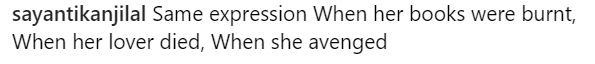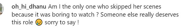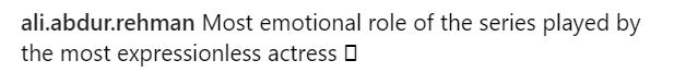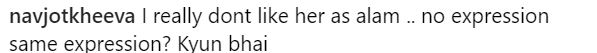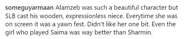 एक और यूजर ने कहा, "आलमजेब बहुत खूबसूरत कैरेक्टर है, लेकिन SLB ने लकड़ी जैसी एक्सप्रेशनलेस भांजी को कास्ट किया। जब भी यह कैरेक्टर स्क्रीन पर होता तो मजा आ जाता, लेकिन मुझे यह बिल्कुल भी पसंद नहीं आईं। यहां तक कि साइमा का किरदार निभाने वाली लड़की भी शर्मिन से कहीं बेहतर थीं।" हर कोई शर्मिन को एक्सप्रेशनलेस कह रहा है।