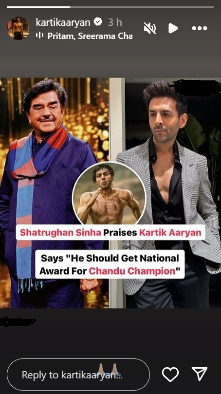 वहीं, अभिनेता शत्रुघ्न सिन्हा ने भी हाल ही में एक इंटरव्यू में कार्तिक आर्यन की तारीफ की है। सिर्फ इतना ही नहीं, बल्कि उन्होंने एक्टर के लिए नेशनल अवॉर्ड तक की मांग कर डाली है। अब 'चंदू चैम्पियन' एक्टर ने भी एक पोस्ट शेयर करते हुए उनका शुक्रिया अदा किया है।
