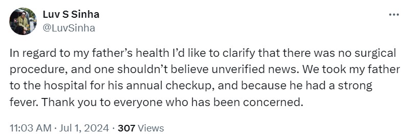 लव सिन्हा ने अपने सोशल मीडिया हैंडल एक्स पर एक ट्वीट किया है। इस पोस्ट में उन्होंने लिखा है कि मेरे पिता के स्वास्थ्य के संबंध में मैं यह साफ करना चाहता हूं कि कोई सर्जिकल प्रोसीजर नहीं हुआ है और किसी को भी अफवाहों वाली न्यूज पर विश्वास नहीं करना चाहिए। हम अपने पिता को उनके एनुअल चेकअप के लिए अस्पताल ले गए थे, क्योंकि उन्हें बहुत तेज बुखार था। सभी का धन्यवाद जिन्होंने उनको लेकर कंसर्न दिखाया।