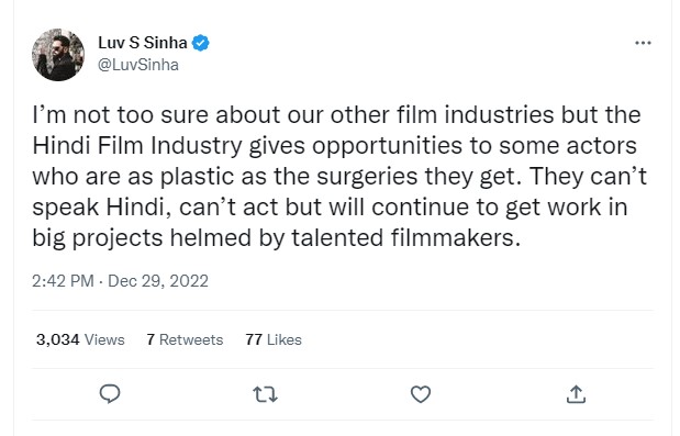 लव सिन्हा ने कहा कि बाकी फिल्म इंडस्ट्री का तो नहीं पता लेकिन हिंदी फिल्म इंडस्ट्री में उन एक्टर्स को मौके मिलते हैं, जो प्लास्टिक सर्जरी की तरह ही प्लास्टिक हैं। उन्हें हिंदी बोलना नहीं आता, ठीक से एक्टिंग भी नहीं कर सकते लेकिन उन्हें टैलेंटेड फिल्ममेकर्स के बड़े प्रोजेक्ट में काम मिलता रहेगा।
