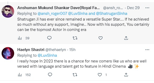 लव सिन्हा के इस ट्वीट के बाद कमेंट सेक्शन में उन्हें नसीहत देने की बाढ़ आ गई है। एक यूजर ने लिखा, 'बहुत मेहनत लगती है बेटा, अपने पिता को देखो..कैसे देवानंद साहब ने उन्हें इंट्रोड्यूज किया था, फिर वह निगेटिव रोल करते चले गए और आखिर में आई कालिचरण...क्या कमाल था...वह कितने हैंडसम लग रहे थे।'