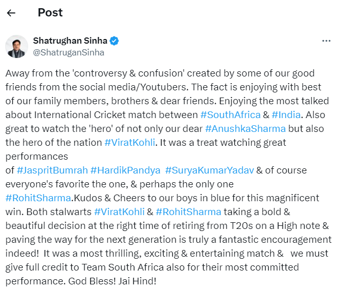 सोमवार को शत्रुघ्न सिन्हा ने एक्स (ट्विटर) पर कुछ तस्वीरें शेयर कीं, जो अस्पताल की लग रही हैं। इसी के साथ उन्होंने टी-20 विश्व कप फाइनल के बारे में भी मैसेज लिखा। उन्होंने बताया है कि शनिवार को उन्होंने अपने दोस्तों और पत्नी पूनम सिन्हा के साथ मैच देखा।
