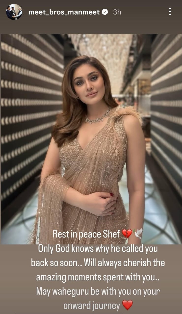 मनमीत सिंह ने शनिवार को अपनी इंस्टाग्राम स्टोरी पर दिवंगत अभिनेत्री के लिए एक भावपूर्ण नोट लिखा। उन्होंने लिखा, "शांति से आराम करो, शेफ। केवल भगवान ही जानता है कि उसने तुम्हें इतनी जल्दी वापस क्यों बुलाया... तुम्हारे साथ बिताए अद्भुत पलों को हमेशा संजो कर रखूंगा... वाहेगुरु तुम्हारी आगे की यात्रा में तुम्हारे साथ रहे।"