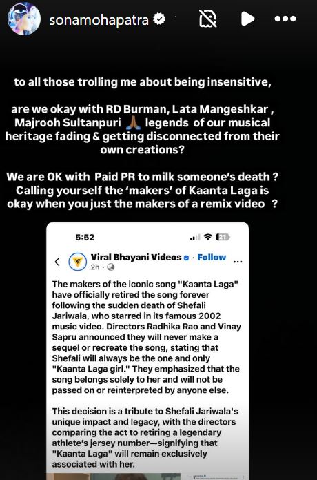 इस एलान के बाद जानी-मानी सिंगर सोना महापात्रा ने एक पोस्ट शेयर किया और बिना नाम लिए डायरेक्टर्स पर तंज कसा। उन्होंने इंस्टाग्राम स्टोरी में लिखा, "3 दिग्गजों ने बनाया कांटा लगा। संगीतकार, गीतकार और गायक- आरडी बर्मन, मजरूह सुल्तानपुरी, लता मंगेशकर। सोना महापात्रा ने आगे लिखा, "खुद को 'निर्माता' कहने वाले लोगों द्वारा एक मौत से कुछ पीआर पाने के लिए यह पूरी तरह से गलत 'सेवानिवृत्ति' है (वायरल बी मुख्य रूप से एक भुगतान वाली साइट है)।"