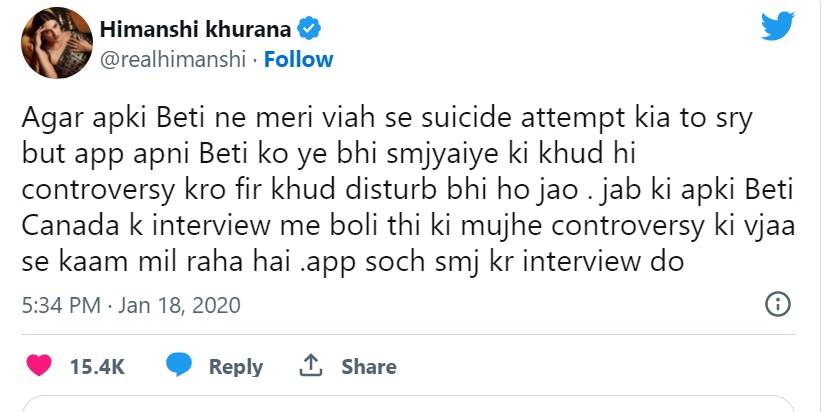 हिमांशी खुराना के साथ ही एक बार शहनाज का काफी विवाद हो गया था। उनके सॉन्ग आई लाइक इट को शहनाज ने घटिया बता दिया था। जिसके बाद सोशल मीडिया पर दोनों की तू-तू, मैं-मैं शुरू हो गई थी। हिमांशी ने उन्हें पलटकर ऐसा जवाब दिया कि पंजाब की कैटरीना कैफ को ये सब अखर गया। ये बात इतनी बढ़ गई कि शहनाज के पिता ने एक इंटरव्यू में बोला कि हिमांशी की वजह से उनकी बेटी सुसाइड करने वाली थी।