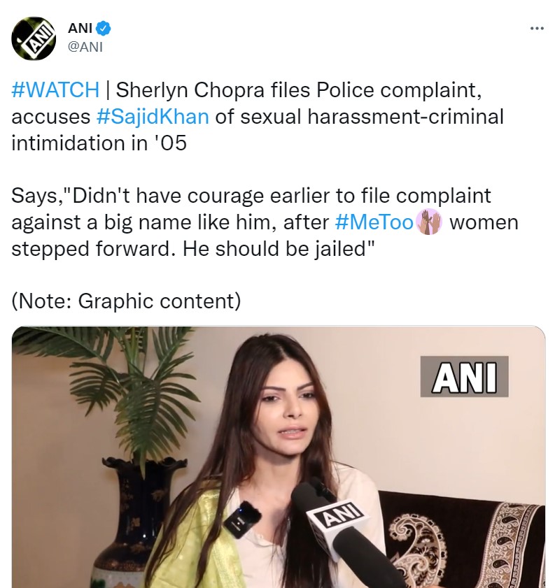शर्लिन चोपड़ा ने न्यूज एजेंसी एएनआई से बात की और साल 2005 में साजिद खान द्वारा उनके साथ किए गए यौन शोषण के बारे में बताया। शर्लिन ने कहा, "हाल ही में मैंने मीटू आरोपी साजिद खान के खिलाफ जुहू पुलिस स्टेशन में यौन शोषण की शिकायत दर्ज कराई है, न सिर्फ यौन शोषण, बल्कि आपराधिक बल और आपराधिक धमकी की भी शिकायत की है। जब मैं यह शिकायत दर्ज कराने गई तो पुलिस ने सबसे पहले मुझसे पूछा कि यह वारदात कब हुई थी, जिस पर मैंने जवाब दिया कि यह 2005 में हुआ था। इसके बाद उन्होंने पूछा कि आपको इतना समय क्यों लगा हम तक पहुंचने में?"