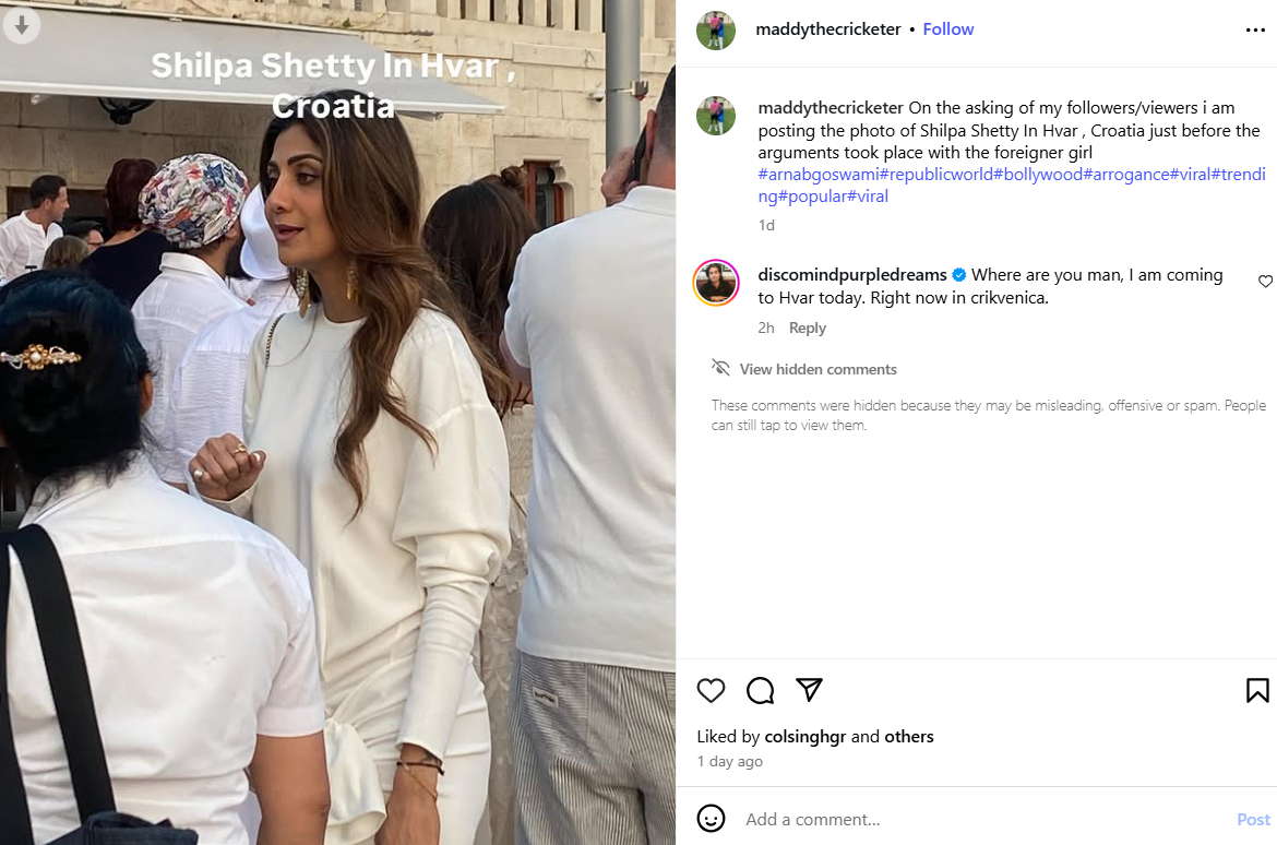 शिल्पा शेट्टी जो वीडियो वायरल हो रहा है, उसमें एक्ट्रेस एक रेस्तरां में सफेद रंग के टॉप और जींस में खड़ी हुई हैं, जहां उनके साथ उनका परिवार भी मौजूद था। वीडियो में शिल्पा शेट्टी दिख तो नहीं रही हैं, लेकिन मैडी द क्रिकेटर नाम के एक पेज ने कैप्शन में शिल्पा शेट्टी का नाम लिखकर ये दावा किया है कि एक्ट्रेस का उस रेस्तरां में एक युवा लड़की के साथ झगड़ा हो गया था। शिल्पा की एक क्लोज फोटो भी इसी इंस्टाग्राम अकाउंट पर शेयर की गई है।