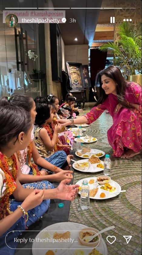 इसी के साथ शिल्पा शेट्टी ने कन्या पूजन की भी फोटो शेयर की। एक्ट्रेस की ये फोटो एक कन्या को खाना खिलाते हुए है।