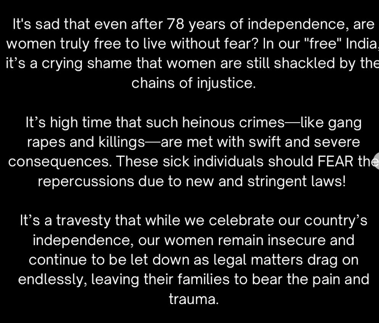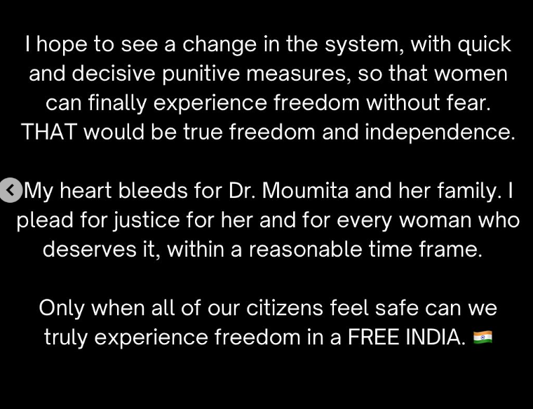 शिल्पा ने लिखा कि मुझे उम्मीद है कि व्यवस्था में बदलाव आएगा, जिसमें त्वरित और निर्णायक दंडात्मक उपाय होंगे, ताकि महिलाएं आखिरकार बिना किसी डर के आजादी का अनुभव कर सकें। यही सच्ची आजादी और स्वतंत्रता होगी। डॉ. मौमिता और उनके परिवार के लिए मेरा दिल दुखता है। मैं उनके लिए और हर उस महिला के लिए न्याय की गुहार लगाती हूं, जो उचित समय सीमा के भीतर इसकी हकदार है। जब हमारे सभी नागरिक सुरक्षित महसूस करेंगे तभी हम स्वतंत्र भारत में वास्तविक रूप से स्वतंत्रता का अनुभव कर सकेंगे।