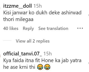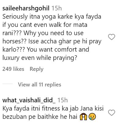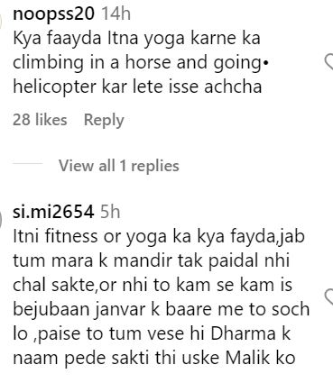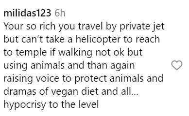 एक और यूजर ने लिखा, "क्या फायदा इतनी फिटनेस का जब जाना किसी बेजुबान पर बैठकर ही है।" एक ने कहा, "आप बहुत अमीर हैं। आप प्राइवेट जेट में ट्रेवल करकी हैं, लेकिन मंदिर तक पहुंचने के लिए हेलीकॉप्टर का इस्तेमाल नहीं कर सकती। अगर चल नहीं पा रही तो जानवर का इस्तेमाल और फिर जानवर के बचाव के लिए आवाज उठाना और फिर वीगन डाइट का ड्रामा करना। ढोंग करने की भी एक सीमा है।"