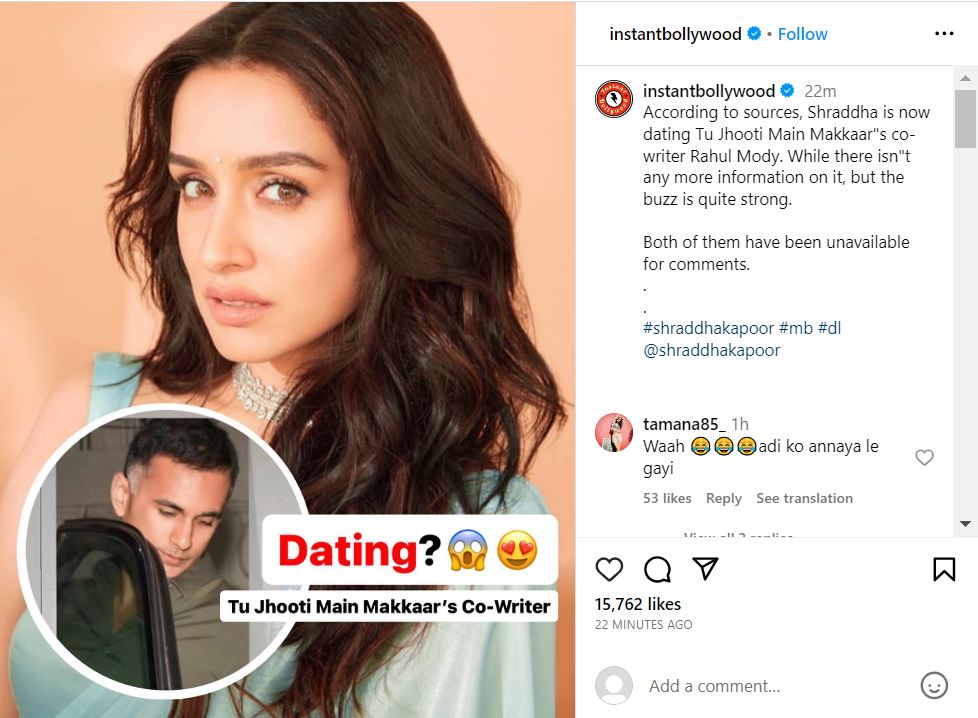 इंस्टेंट बॉलीवुड ने हाल ही में अपने इंस्टाग्राम अकाउंट पर श्रद्धा कपूर की डेटिंग की जानकारी शेयर की है। उन्होंने जानकारी शेयर करते हुए बताया कि श्रद्धा कपूर पिछले काफी समय से फिल्म राइटर राहुल मोड़ी को डेट कर रही हैं। आपको बता दें कि राहुल इंडस्ट्री के लोकप्रिय राइटर्स में से एक हैं।