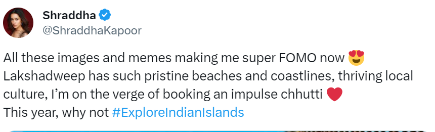 श्रद्धा कपूर ने अपने सोशल मीडिया हैंडल एक्स पर लक्षद्वीप की एक तस्वीर शेयर की और लिखा 'ये सभी तस्वीरें और मीम्स मुझे अब सुपर FOMO बना रहे हैं, लक्षद्वीप में ऐसे प्राचीन समुद्र तट हैं, जो स्थानीय संस्कृति से समृद्ध हैं। मैं एक लंबी छुट्टी बुक करने के कगार पर हूं। इस साल एक्सप्लोर इंडियन आइलैंड्स क्यों नहीं'।