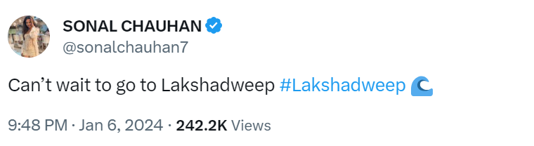 सोनल चौहान ने पोस्ट करते हुए लिखा- 'लक्षद्वीप जाने के लिए इंतजार नहीं कर सकती'।