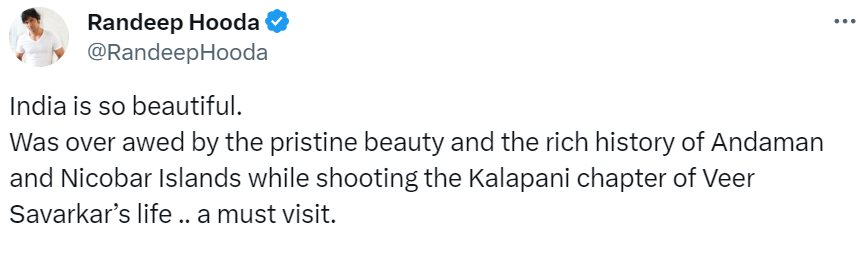 रणदीप हुड्डा ने भी कई तस्वीरें शेयर करते हुए लिखा 'भारत बहुत सुंदर है। वीर सावरकर के जीवन के कालापानी अध्याय की शूटिंग के दौरान अंडमान और निकोबार द्वीप समूह की प्राचीन सुंदरता और समृद्ध इतिहास से अभिभूत हो गया था। अवश्य देखें'।