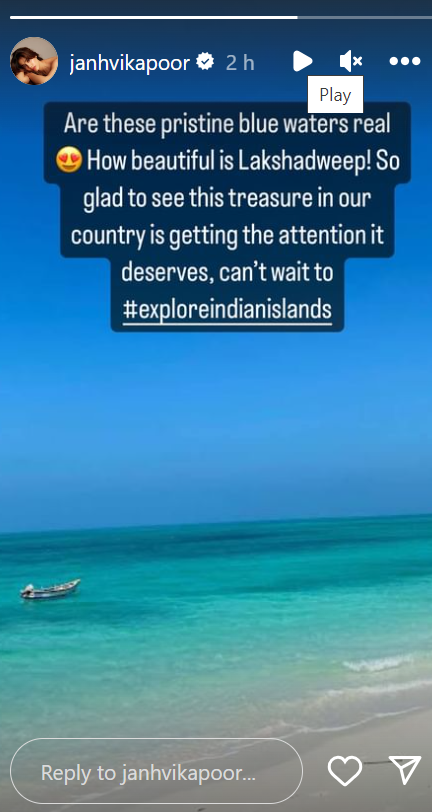 जाह्नवी कपूर ने इंस्टाग्राम स्टोरी में लक्षद्वीप की तस्वीर शेयर करते हुए लिखा 'क्या ये नीला पानी असली है। लक्षद्वीप कितना सुंदर है। यह देखकर बहुत खुशी हुई कि हमारे देश में इस खजाने को वह ध्यान मिल रहा है, जिसका वह हकदार है। एक्सप्लोर इंडियन आइलैंड्स के लिए इंतजार नहीं कर सकती'।