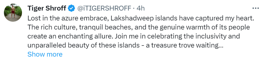 टाइगर श्रॉफ ने भी प्रधान मंत्री नरेंद्र मोदी द्वारा शुरू किए गए विचार को अपना समर्थन दिया। टाइगर ने एक्स पर लिखा 'नीले आलिंगन में खोए लक्षद्वीप द्वीपों ने मेरा दिल जीत लिया है। समृद्ध संस्कृति, शांत समुद्र तट और यहां के लोगों की वास्तविक गर्मजोशी एक मनमोहक आकर्षण पैदा करती है। इन द्वीपों की समावेशिता और अद्वितीय सुंदरता का जश्न मनाने में मेरे साथ शामिल हों - एक खजाना जो इंतजार कर रहा है'।