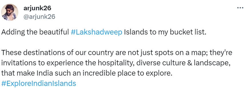 कार्तिक आर्यन ने एक्स पर लिखा 'अतुल्य भारत सिर्फ एक टैग नहीं है, हमारे खूबसूरत देश में कुछ सबसे अविश्वसनीय और आश्चर्यजनक स्थान हैं और लक्षद्वीप इसका एक उदाहरण है। भारत में ही एक स्वर्ग जैसा स्थान। इस खूबसूरत भारतीय द्वीप को देखने के लिए अब और इंतजार नहीं कर सकते'।