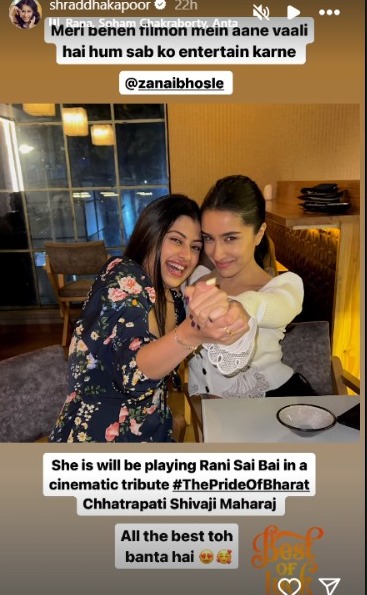 वह छत्रपति शिवाजी पर बन रही फिल्म में रानी साईबाई का किरदार निभा रही हैं, एक ऑल द बेस्ट तो बनता है"। आपको बता दें कि रानी सईबाई भोसले मराठा साम्राज्य के संस्थापक शिवाजी की पहली पत्नी थीं।