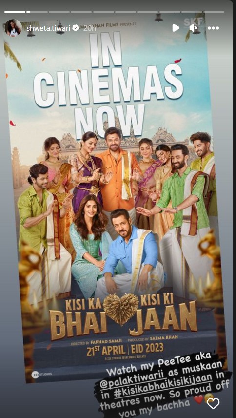 बेटी की एक्टिंग देख श्वेता तिवारी ने कहा, ''मैंने अपनी पीती उर्फ पलक तिवारी को मुस्कान के रोल में किसी का भाई किसी की जान में देखा। मुझे तुमपर गर्व है।'' श्वेता ने खुद तो पलक के अभिनय के लिए तारीफों के पुल बांधे ही। साथ ही उन पोस्ट को भी शेयर किया, जिसमें फैंस ने पलक की तारीफ की हो।