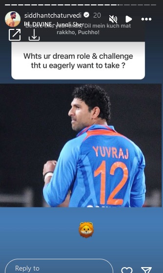 दरअसल सिद्धांत चतुर्वेदी की इंस्टा स्टोरी देखकर फैंस इस बात की अंदाजा लगा रहे हैं कि वो आने वाले समय में युवराज सिंह बनकर दर्शकों का मनोरंजन करते नजर आएंगे। दरअसल एक्टर ने हाल ही में अपने सोशल मीडिया पेज पर AMA सेशन रखा था। इस दौरान उन्होंने फैंस के कई सवालों का जवाब दिया। एक फैन ने सिद्धांत से पूछा कि उनका ड्रीम रोल क्या होगा। इसके जवाव में सिद्धांत ने नीली जर्सी में क्रिकेटर युवराज सिंह की एक तस्वीर शेयर की और एक शेर वाला इमोजी बनाया। स्टोरी देखकर फैंस एक्साइटेड हो गए कि एक्टर युवराज सिंह की कहानी बड़े पर्दे पर लेकर आने वाले हैं।