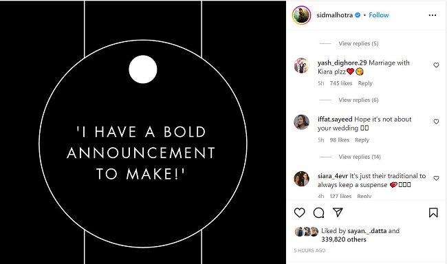 अब रविवार को उन्होंने अपने फैंस को उस समय चकित कर दिया, जब उन्होंने एक पोस्ट के माध्यम से इस बात की जानकारी दी कि वह जल्द बड़ी घोषणा करने वाले हैं। उन्होंने किसी और चीज की जानकारी नहीं दी है। हालांकि, फैंस को लगता है कि वह जल्द कियारा आडवाणी के साथ अपनी शादी के बारे में बताने वाले हैं। सिद्धार्थ मल्होत्रा ने एक पोस्ट शेयर किया है। इस पर लिखा है, 'मुझे एक बोल्ड स्टेटमेंट अनाउंसमेंट करनी है।' इसके साथ उन्होंने लिखा है, 'कुछ बोल्ड और उत्साहित कर देने वाला कल आ रहा है।' उनके फैंस इस पर जमकर प्रतिक्रिया दे रहे हैं। वे उनसे पूछ रहे हैं कि क्या वह अपनी गर्लफ्रेंड कियारा आडवाणी से शादी कर रहे हैं। एक फैन ने लिखा है, 'कियारा के साथ शादी हो रही है?' एक ने लिखा है, 'शादी की अनाउंसमेंट।'