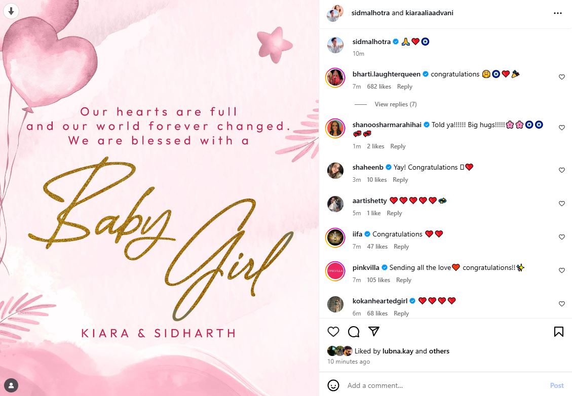 सिद्धार्थ मल्होत्रा ने अपने आधिकारिक इंस्टाग्राम अकाउंट पर बेटी के जन्म की खुशी शेयर की है। उन्होंने कुछ घंटे बाद ही एक पोस्ट शेयर करते हुए लिखा, "हमारा दिन भावनाओं से भर गया है, क्योंकि अब हमारी जिंदगी पूरी तरह से बदल चुकी है। हमें बेटी हुई है। आप सभी के कियारा और सिद्धार्थ"। इस पोस्ट के साथ कैप्शन में सिद्धार्थ मल्होत्रा ने नमस्कार, हार्ट और नजर का इमोजी शेयर किया।