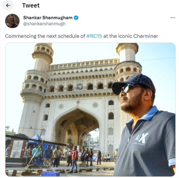 निर्देशक एस शंकर ने हाल ही में हैदराबाद के चारमीनार की एक फोटो पोस्ट करते हुए लिखा, 'चारमीनार में हमारा आरसी-15 का अगला शेड्यूल शूट हो रहा है'। आपको बता दें कि अपनी शादी से पहले कियारा एक्टर राम चरण संग अपनी फिल्म के पहले शेड्यूल को शूट कर चुकी हैं और वह जल्द ही दूसरे शेड्यूल के लिए अपनी टीम को ज्वाइन करने वाली हैं।