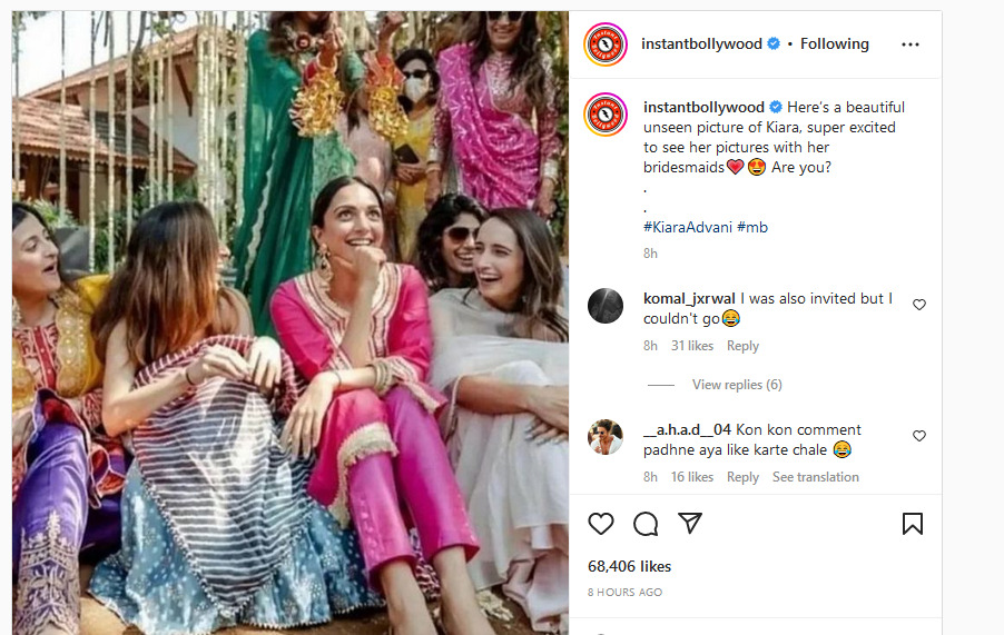 कियारा आडवाणी और सिद्धार्थ मल्होत्रा की शादी में नो फोन पॉलिसी और टाइट सिक्योरिटी के बीच होने वाली दुल्हन की एक तस्वीर लीक (Leak) हो गई है। कियारा की सामने आई तस्वीर उनके प्री-वेडिंग फंक्शन्स की बताई जा रही है। इस फोटो में आप देख सकते हैं कि कियारा अपनी सहेलियों के साथ नजर आ रही हैं। इस दौरान उन्होंने गुलाबी रंग का सलवार सूट पहना हुआ है। इसके साथ होने वाली दुल्हनियां ने अपने कानों में बड़े झुमके पहने हैं। बता दें कि ये कियारा की नहीं बल्कि किसी और की शादी की फोटो है, जिसमें एक्ट्रेस के ऊपर दुल्हन कलीरे गिराने की रस्म कर रही हैं। इस तस्वीर को फैंस काफी पसंद कर रहे हैं। हालांकि, फैंस बड़ी ही बेसब्री से कियारा और सिद्धार्थ को दुल्हा-दुल्हन के लिबास में देखने के लिए बेताब हैं।