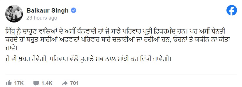सिद्धू के पिता ने फेसबुक पर पंजाबी में लिखा, 'हम सिद्धू के प्रशंसकों के आभारी हैं, जो हमारे परिवार के बारे में चिंतित हैं। लेकिन हम अपील करते हैं कि परिवार के बारे में कुछ अफवाहें चल रही हैं, उन पर यकीन न करें। जो भी जानकारी होगी, हम आपके साथ शेयर करेंगे।'