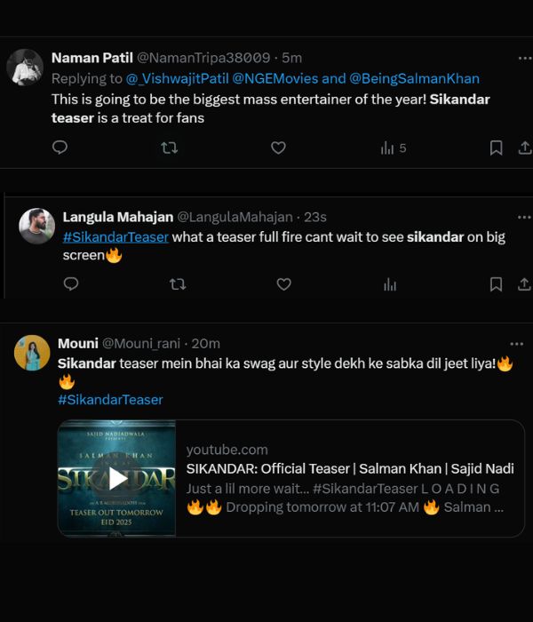 कुछ यूजर्स सलमान की फिल्म के टीजर को साल का सबसे धांसू टीजर भी बता रहे हैं। एक एक्स यूजर ने पोस्ट में लिखा, सिकंदर साल की सबसे ज्यादा मनोरंजन करने वाली फिल्म साबित होगी।