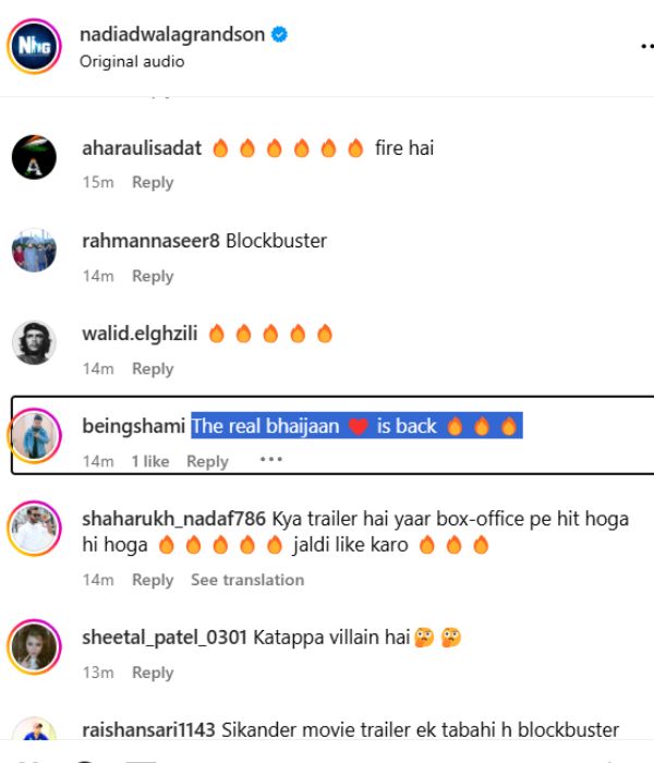 एक यूजर ने साजिद नाडियाडवाला की प्रोड्यूस फिल्म की तारीफ करते हुए लिखा, 'सर चाहे टीजर, गाने और ट्रेलर कैसा भी हो। सलमान की फिल्म का आज तक का रिकॉर्ड रहा है कि कोई भी फैमिली के साथ बैठकर उनकी फिल्म देख सकता है। सलमान भाई की फिल्म मतलब की परिवार के साथ जाकर अच्छे से एंजॉय करें।'
