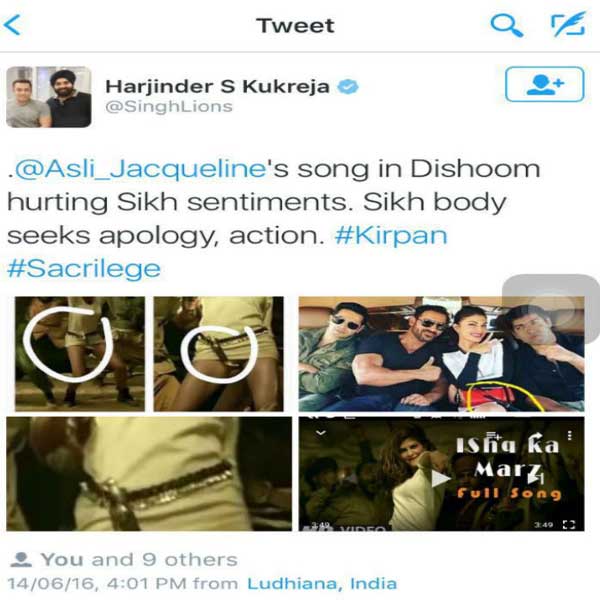 सेंसर बोर्ड प्रमुख पहलाज निहलानी को लिखे खत में सिरसा ने कहा है कि गानेे में अर्ध-नग्न एक्ट्रेस (जैकलिन) को को-स्टार्स वरुण धवन और जॉन अब्राहम के साथ कृपाण लिए डांस करते हुए दिखाया गया है। सिख द्वारा पहने जाने वाले पांच अनिवार्य ककार में से एक कृपाण पैरों के आगे लटक रहा है और एक्ट्रेस द्वारा कमर में बांधा गया है। सिरसा जोर देते हुए कहा है कि गाना बेहद आपत्तिजनक है और सिख सिद्धांतों व परंपराओं का अपमान है। वहीं 'बॉलीवुड लाइफ' की रिपोर्ट में, हरजिंदर एस कुकरेजा नामक एक सामाजिक कार्यकर्ता द्वारा किए गए ट्वीट का हवाला भी दिया गया है। हालांकि उन्होंने अपना ट्वीट बाद में डिलीट कर दिया। इसमें आपत्तिजनक तस्वीरें भी शामिल हैं।