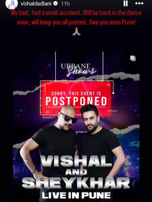 इस इवेंट को अर्बन शोज ऑर्गेनाइज करा रहे थे। उन्होंने अपने अकाउंट पर भी इसकी जानकारी देते लिखा कि हमें आपको यह बताते हुए खेद है कि 2 मार्च 2025 को होने वाला फेमस जोड़ी विशाल और शेखर का मोस्ट अवेटेड अर्बन शोज म्यूजिक कॉन्सर्ट की डेट विशाल ददलानी के एक्सीडेंट की वजह से आगे बढ़ा दी गई है। फिलहाल उनका ट्रीटमेंट चल रहा ह। सिंगर ने अपनी स्टोरी में ये भी बताया कि टिकट पार्टनर की तरफ से जिन्होंने भी टिकट खरीदा उन्हें पूरे पैसे रिफंड कर दिए जाएंगे।