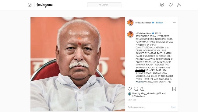 हार्ड कौर ने सोशल मीडिया की अपनी पोस्ट में माननीय मोहन भागवत जी को न सिर्फ जातिवादी बताया है बल्कि देश में हुई बड़ी आतंकी घटनाओं के लिए भी उन्हें और संघटन राष्ट्रीय स्वयंसेवक संघ RSS को जिम्मेदार ठहराया हैं फिर चाहे वो 26/11 का मुंबई टेरर अटैक हो या पुलवामा हमलाl