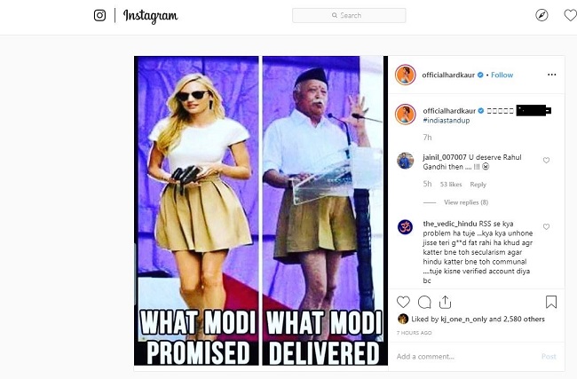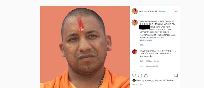 उन्होंने अपने वैरिफाइड इंस्टाग्राम अकाउंट से एक के बाद एक ऐसे कई पोस्ट किए हैंl जिनमें उत्तर प्रदेश के मुख्यमंत्री योगी आदित्यनाथ और राष्ट्रीय स्वयंसेवक संघ के सरसंघचालक मोहन भागवत के विरुद्ध आपत्तिजनक भाषा और शब्दों का प्रयोग किया गया हैंl हार्ड कौर पहले भी कई सेलेब्रिटीज, राजनेताओं को लेकर ऐसे विवादित पोस्ट लिख चुकी हैं लेकिन इस बार योगी आदित्यनाथ और मोहन भागवत पर उनकी आपत्तिजनक टिप्पणियों के लिए सोशल मीडिया पर उन्हें भरपूर लताड़ मिल रही हैl