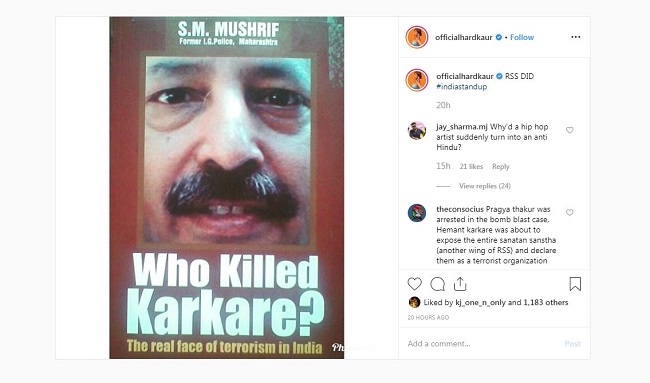 हार्ड कौर ने इस मौके पर Who killed Karkare नामक एक किताब के पहले पेज की तस्वीर भी शेयर की है, जिसे S M Mushrif ने लिखा हैl