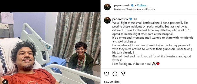 तस्वीरें शेयर करते हुए गायक पपोन ने लिखा है, "हम सभी छोटी लड़ाइयां अकेले लड़ते हैं। मुझे इस प्रकार के वाकये सोशल मीडिया पर पोस्ट करना अच्छा नहीं लगता लेकिन बीती रात अलग थी। पहली बार मेरा छोटा बेटा जो मात्र 13 वर्ष का है। अस्पताल में मेरे लिए नाइट अटेंडेंट बना रहा। यह मेरे लिए इमोशनल मोमेंट है। मैं इसे अपने परिवार और दोस्तों के साथ साझा करना चाहता था।"