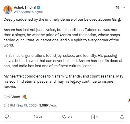 असम के केबिनेट मिनिस्टर अशोक सिंघल ने अपने उनकी मौत की जानकारी अपने आधिकारिक एक्स अकाउंट पर शेयर करते हुए लिखा, "हमारे प्यारे जुबिन गर्ग के अचानक निधन से बेहद दुखी हूं। असम ने सिर्फ एक आवाज को ही नहीं, बल्कि अपनी हार्टबीट को खो दिया है। जुबिन एक सिंगर से कई ज्यादा था, वह असम और पूरे देश का गर्व था, जिनके गाने हमारे कल्चर, इमोशंस और हमारी स्पिरिट को दुनियाभर में पहुंचाती है"।