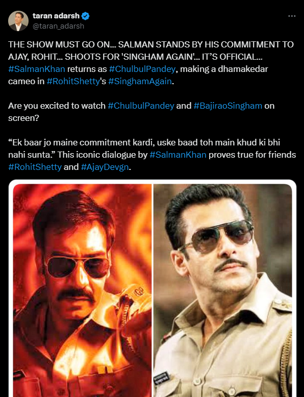 ट्रेड एनालिस्ट तरण आदर्श जिन्होंने कुछ दिनों पहले ये कहा था कि सलमान खान 'सिंघम अगेन' का हिस्सा नहीं हैं, अब उन्होंने खुद ही अपने आधिकारिक एक्स अकाउंट पर दबंग खान के फिल्म का हिस्सा होने की पुष्टि की है। उन्होंने एक फोटो शेयर करते हुए लिखा, "शो मस्ट गो ऑन...सलमान खान ने अजय और रोहित शेट्टी को अपना दिया हुआ कमिटमेंट पूरा किया है। उन्होंने फिल्म सिंघम अगेन के लिए शूट किया है।