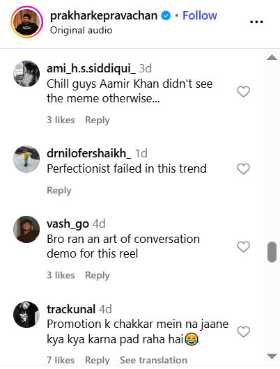 दूसरे यूजर ने लिखा, "क्यों एक्टिंग नहीं हो रही"। एक और अन्य यूजर ने लिखा, "इस ट्रेंड को हर किसी ने मिस्टर परफेक्शनिस्ट से ज्यादा अच्छे तरीके से किया है। एक फैन ने तो ये तक कह दिया कि परफेक्शनिस्ट इस ट्रेंड में फेल हो गए हैं"। आमिर खान की सितारे जमीन पर की बात करें तो मूवी 20 जून को थिएटर में आएगी।
